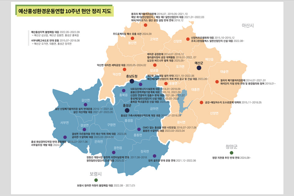 이후 이들은 △산업단지 △폐기물 매립장 △채석장 △골프장 △불법매립 △관광개발 등 다양한 환경 현안에 대응하며 꾸준히 활동해 왔으며, 지금까지 홍성군 11개 읍면 중 8곳과 예산군 12개 읍면 중 9곳에서 총 38건의 환경 문제에 직·간접적으로 관여해 왔다.