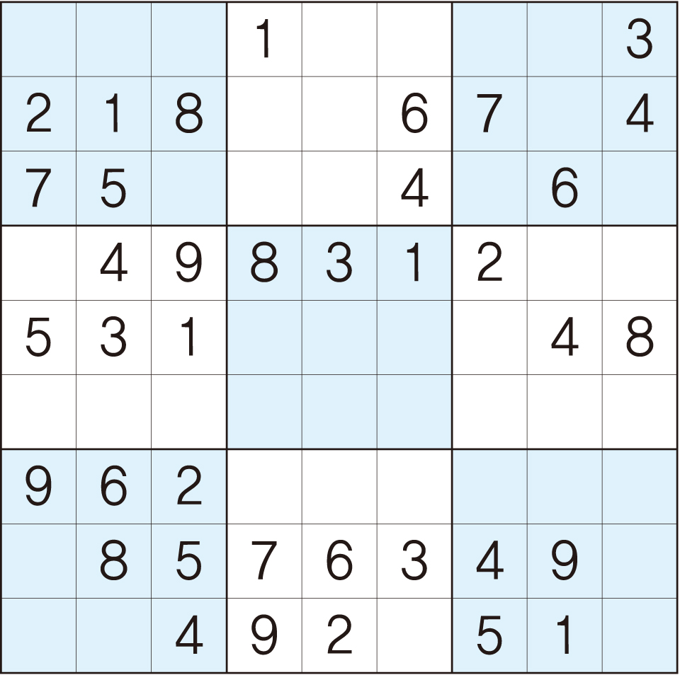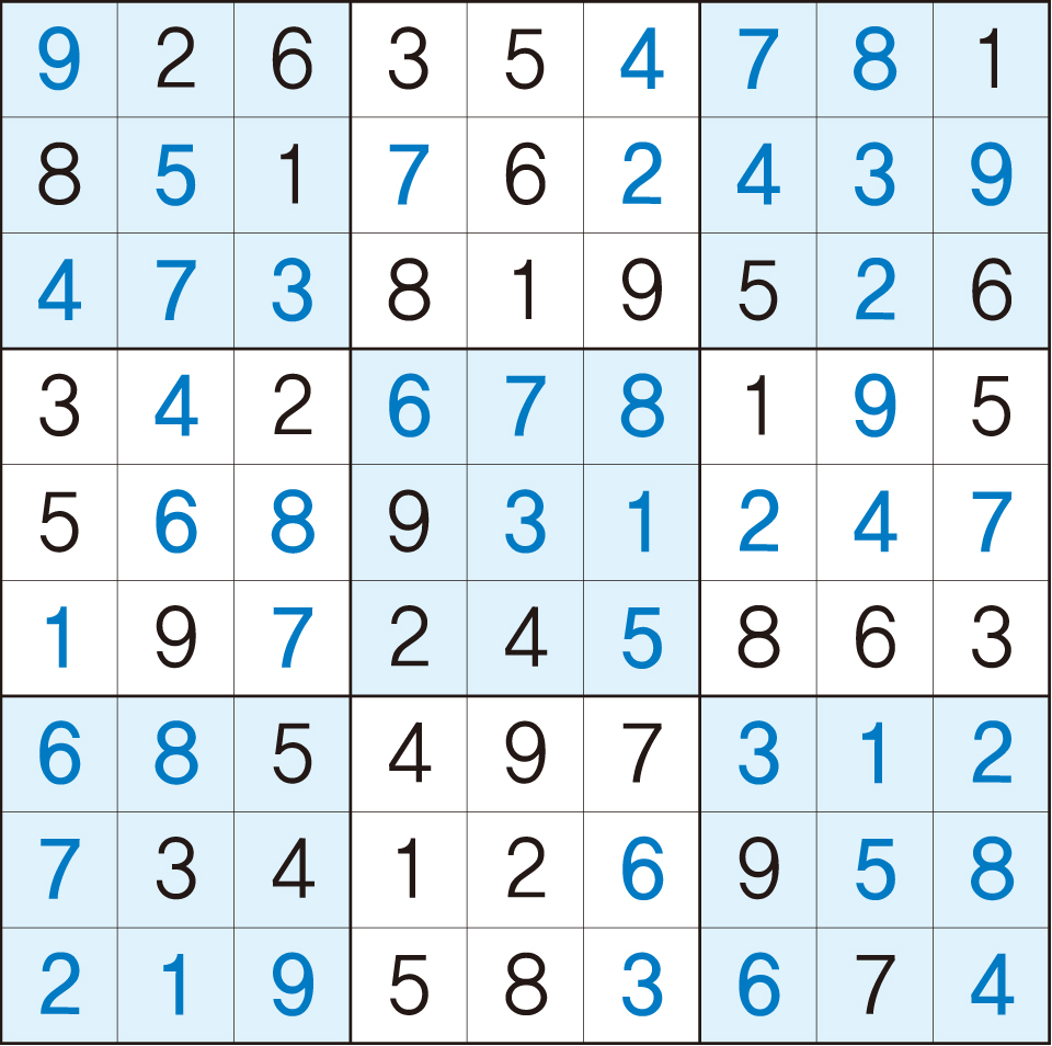 3. 큰 정사각형(9x9) 안에 있는 작은 정사각형(3x3) 안에는 숫자 1~9가 각 한 번씩 들어간다.