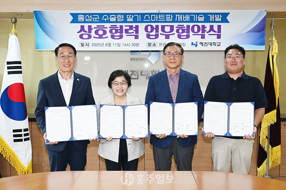 혜전대학교(총장 이혜숙)는 지난 11일 대학본부 회의실에서 홍성군, 연암대학교, 농업회사법인 ㈜헤테로와 함께 ‘홍성군 수출형 딸기 스마트팜 재배기술 공동개발’을 위한 4자 업무협약을 체결했다.<사진>