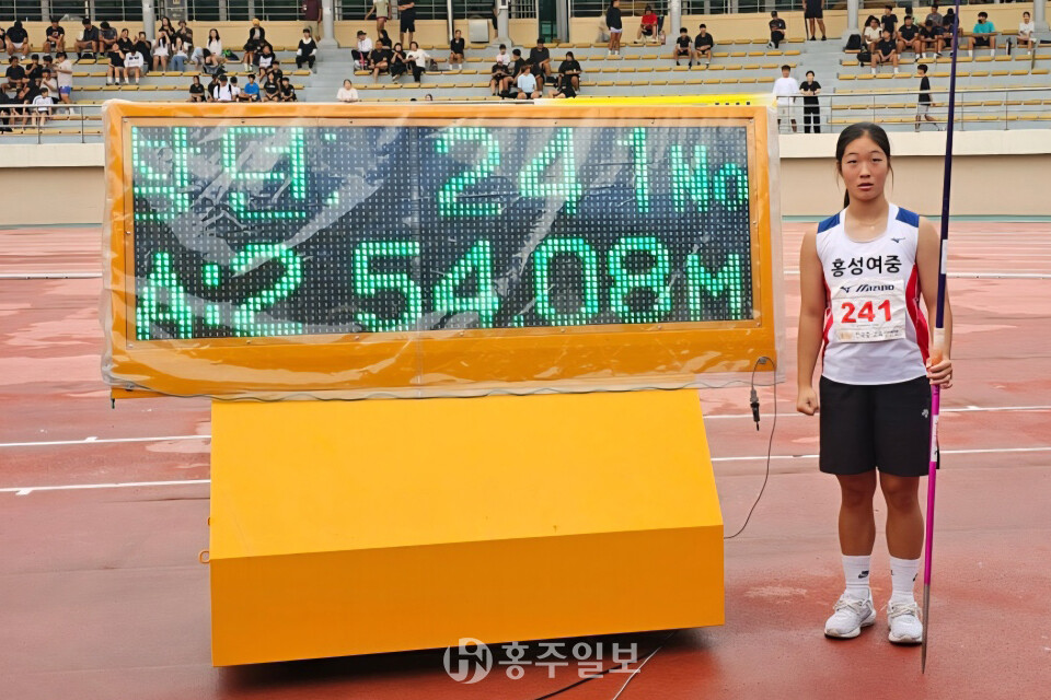 홍성여중 3학년 박혜린 선수가 또다시 전국 육상 무대에서 부별 한국신기록을 새로 썼다. 박 선수는 지난 9일 충북 보은군 공설운동장에서 열린 제54회 추계 전국중·고등학교 육상경기대회 여중부 창던지기 결선에서 54m 08㎝를 던져 우승과 함께 한국신기록을 경신했다.