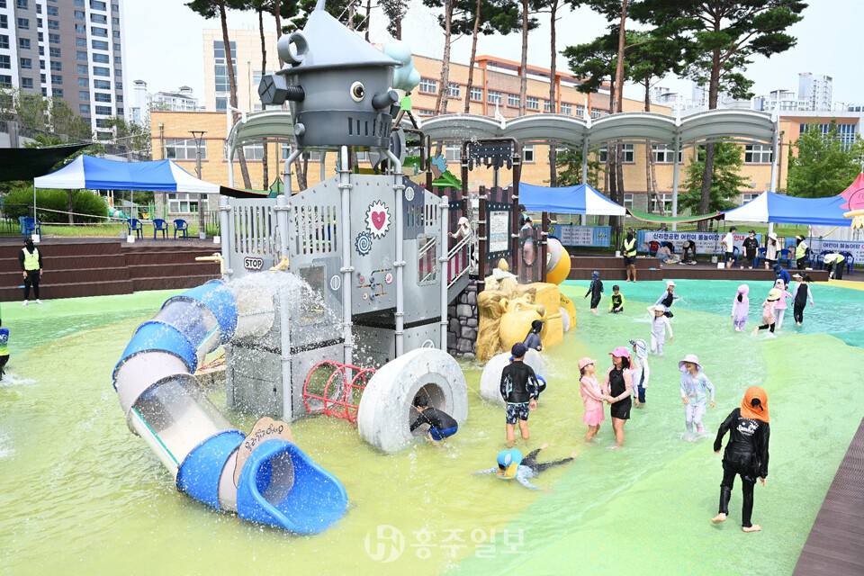 [홍주일보 홍성=한기원 기자] 이용록 홍성군수가 지난 8일 시원한 물줄기 속에서 뛰노는 아이들의 웃음소리가 가득한 어린이 물놀이장을 찾아 시설을 점검하고 “안전은 아무리 강조해도 지나치지 않다”며 물놀이 시설 점검과 안전수칙 준수의 중요성을 강조했다. 사진은 내포신도시 신리천공원 어린이 물놀이장에서 시원하게 물놀이를 즐기는 아이들 모습.