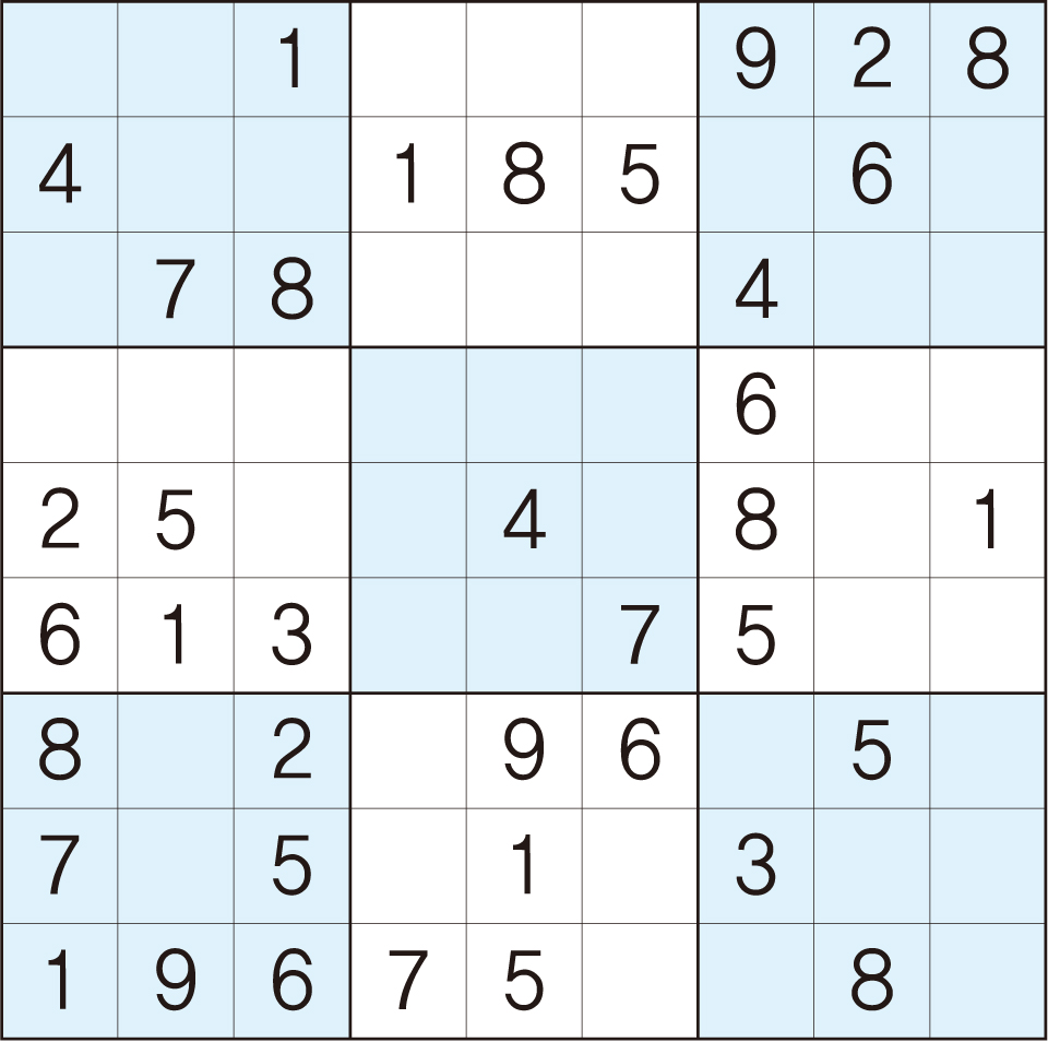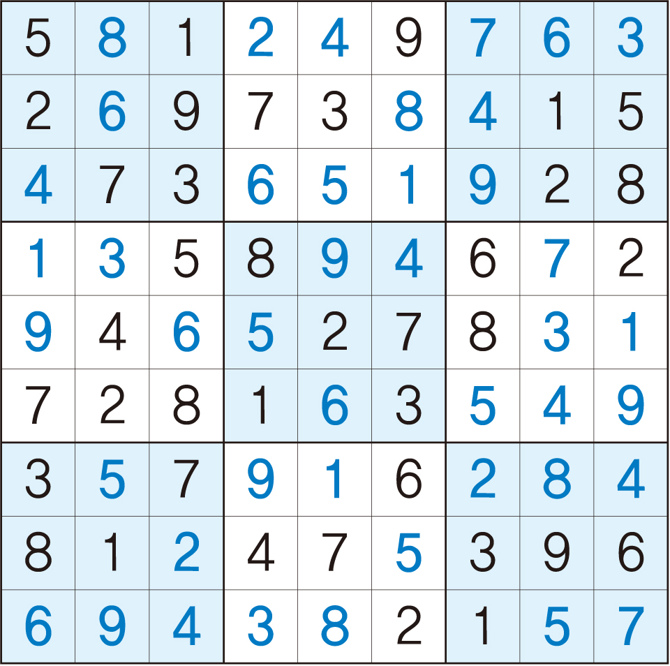 3. 큰 정사각형(9x9) 안에 있는 작은 정사각형(3x3) 안에는 숫자 1~9가 각 한 번씩 들어간다.