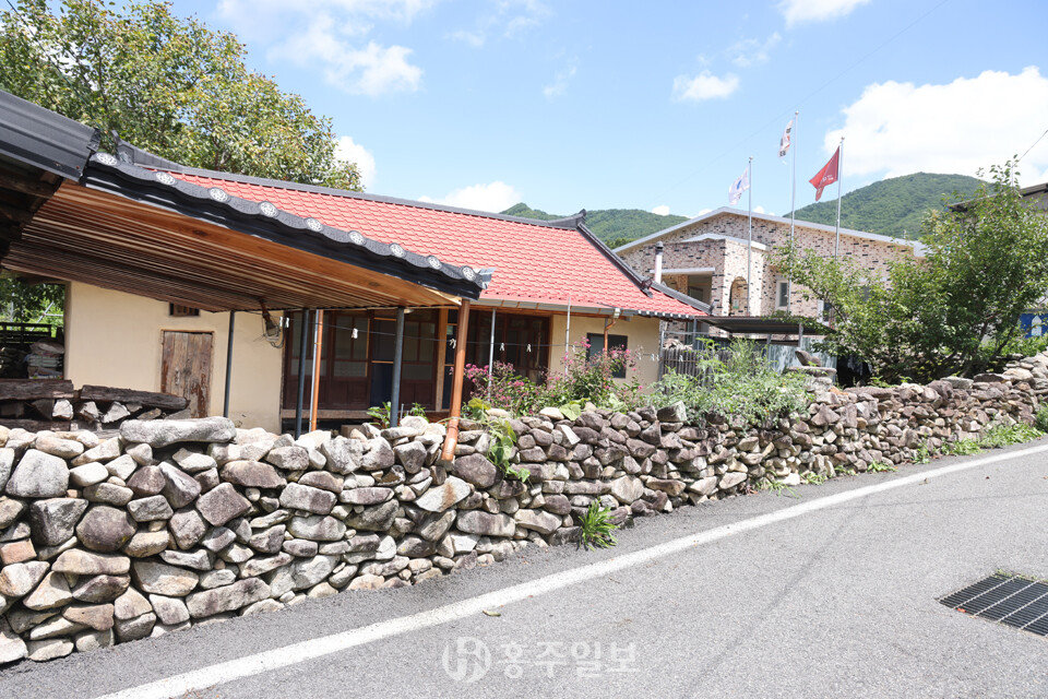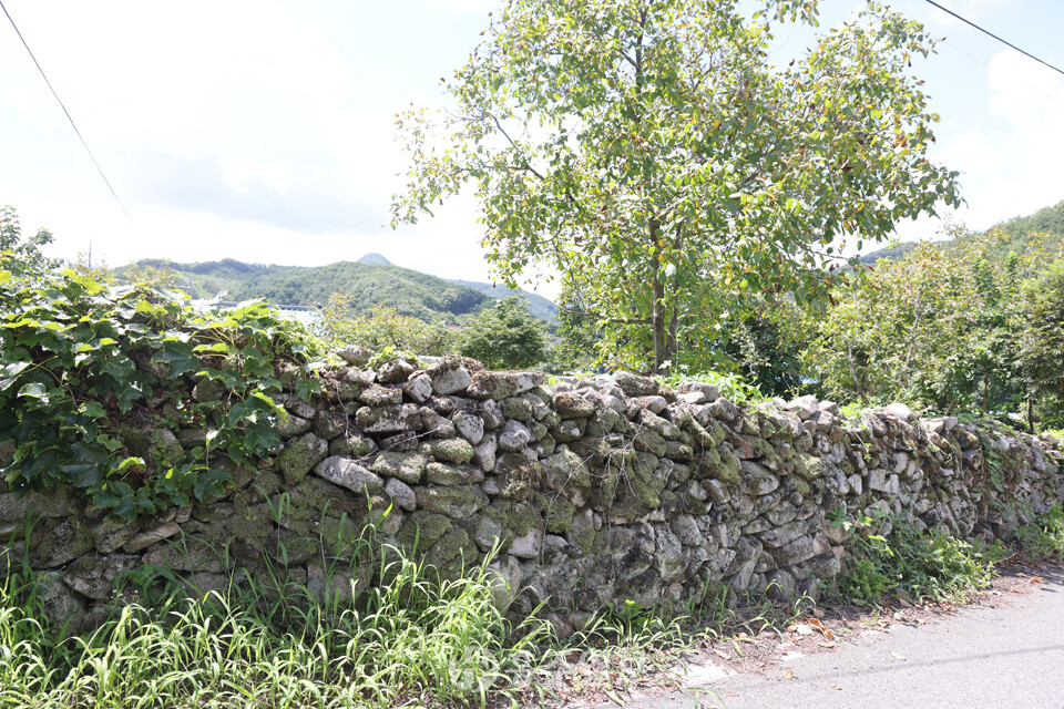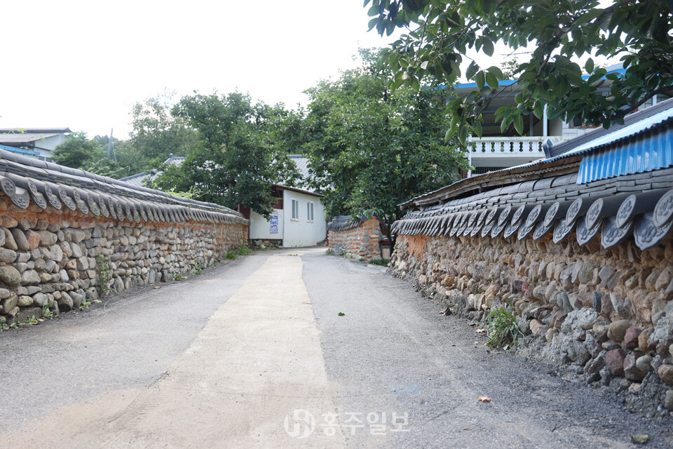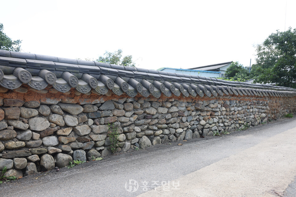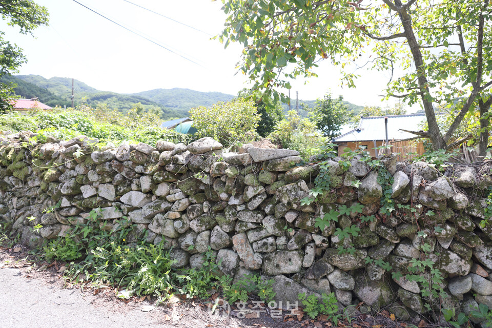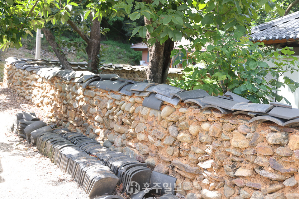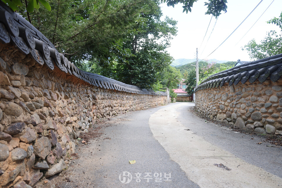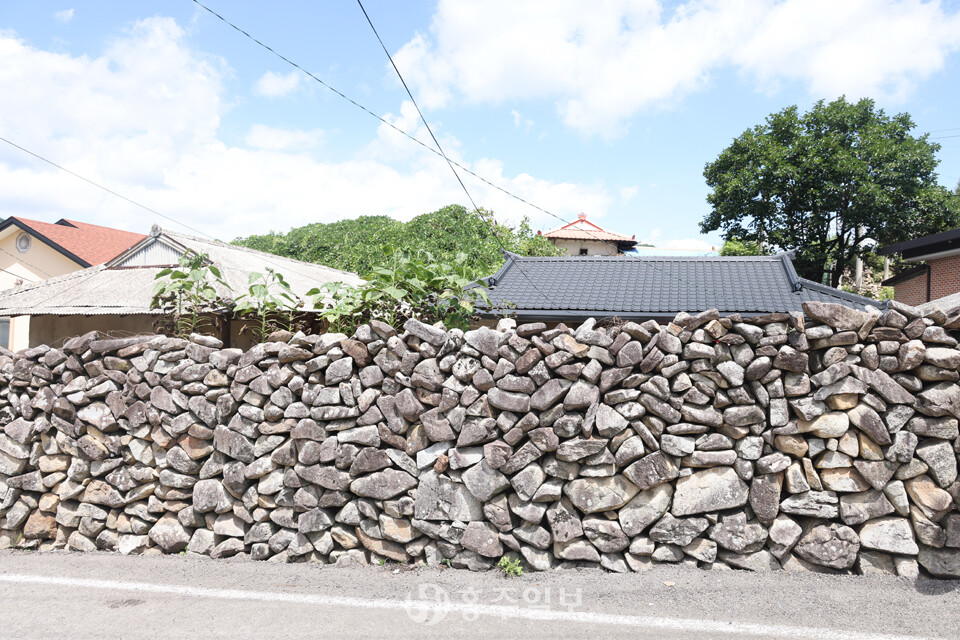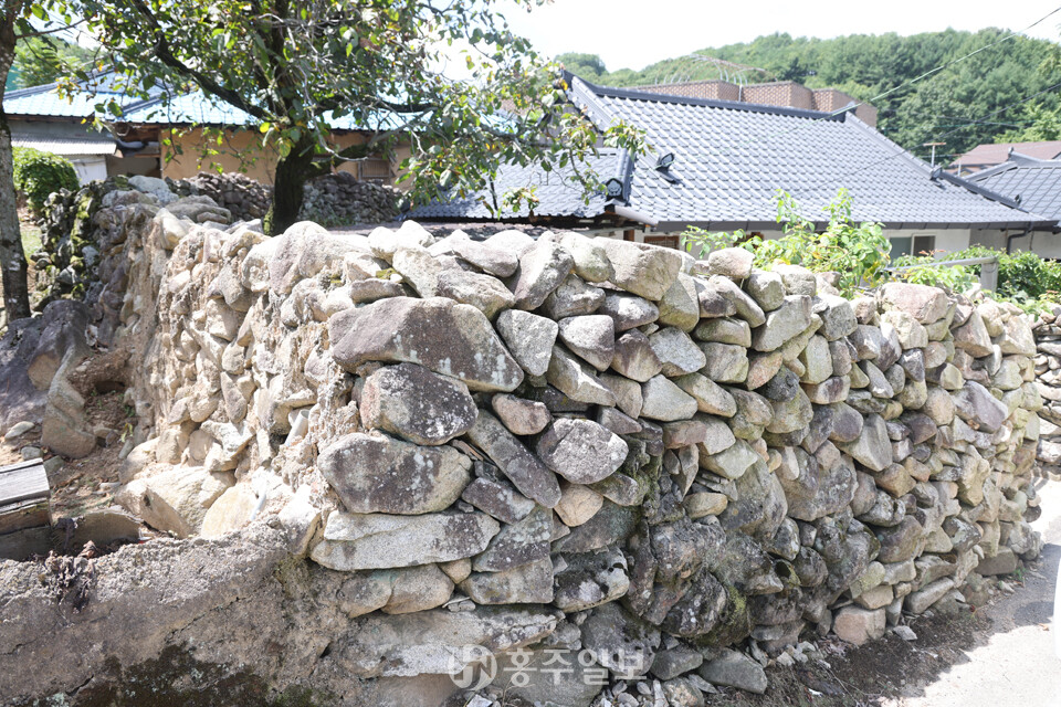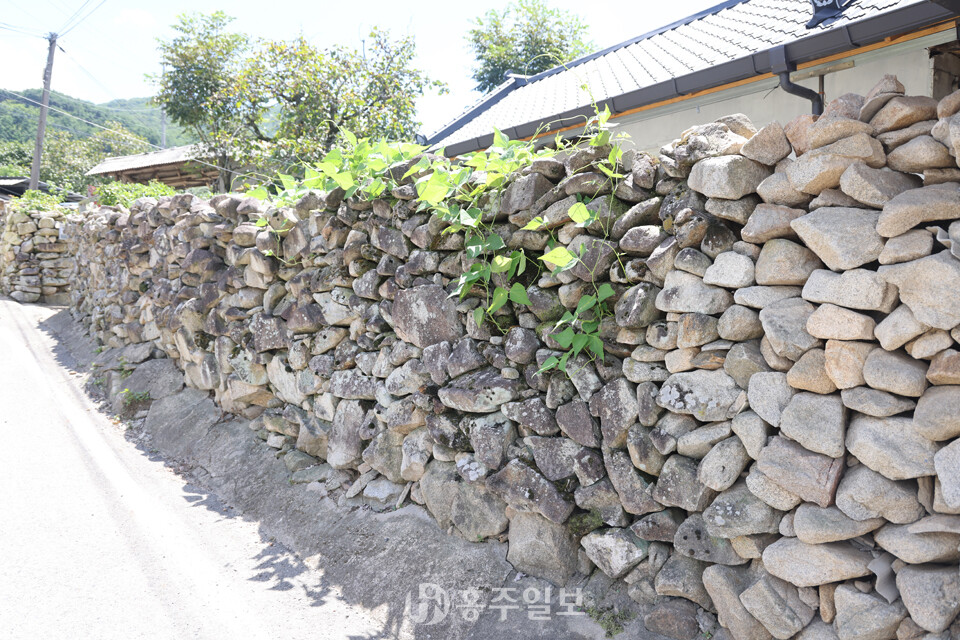 또 하나 이 마을의 매력이라면 아름다운 돌담을 꼽을 수 있다. 돌과 황토 흙으로 쌓아 올리고 기와를 올린 방식의 옛스런 예쁜 돌담이 정말 매력적이다. 다른 지역의 돌담쌓기 방식과 비슷한데, 사용한 돌은 주변에서 쉽게 구할 수 있는 자연석 강돌로 황토흙을 사용해 섞어쌓기 방식으로 쌓았고 높이는 사람의 어깨높이를 넘지 않는다. 일부는 강돌만으로 쌓은 곳도 있다. 강돌과 황토흙을 섞어 담장의 아랫부분은 큰 돌을 사용했고, 윗부분으로 갈수록 작은 돌로 쌓았고, 마무리는 기와를 올렸다.
