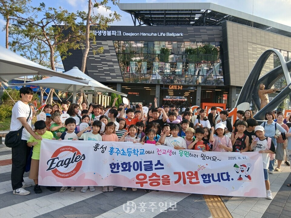 [홍주일보 홍성=이정은 기자] 80여 년 역사를 뒤로한 채 2026년 내포신도시 이전 개교를 앞둔 홍주초등학교(교장 정관호)가 재학생들의 아쉬움을 달래기 위해 지난 21일 전교생·교직원·학부모·운영위원회가 함께하는 야구장 체험학습을 진행했다.<사진>