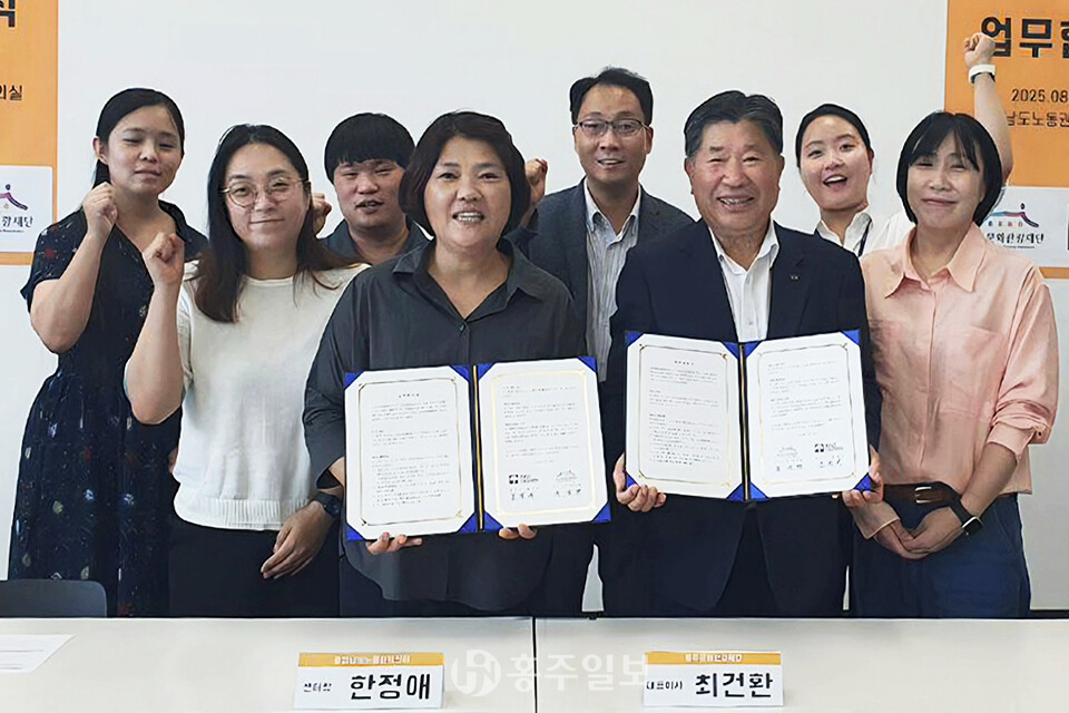 [홍주일보 한기원 기자] 홍주문화관광재단(대표이사 최건환)과 충청남도노동권익센터(센터장 한정애)이 지난 19일 노동 권익 보호와 인권 증진을 위한 업무협약을 체결했다.