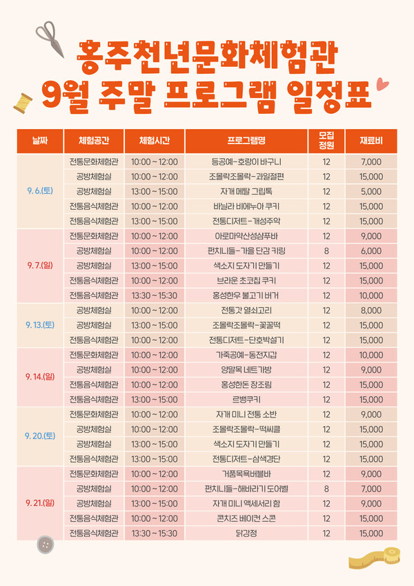 신청은 오는 27일부터 다음달 12일까지 홍성군청 누리집(통합예약→교육강좌→홍주천년문화체험관 체험신청)에서 선착순으로 진행되며, 체험비는 무료이나 프로그램 운영에 따른 재료비는 참가자가 부담해야 한다.