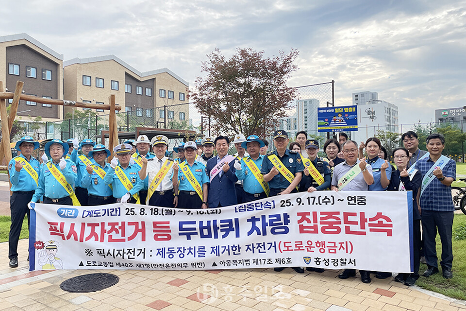 [홍주일보 홍성=한기원 기자] 홍성경찰서(서장 이동규)는 최근 유행하고 있는 픽시자전거 등 두바퀴차 사고 예방을 위해 민·관·경 합동으로 지난 2일 홍북초등학교 앞에서 학생과 학부모 등을 대상으로 ‘픽시자전거 도로 운행 금지 및 PM 등 두바퀴차 사고예방 캠페인’을 실시했다.<사진>