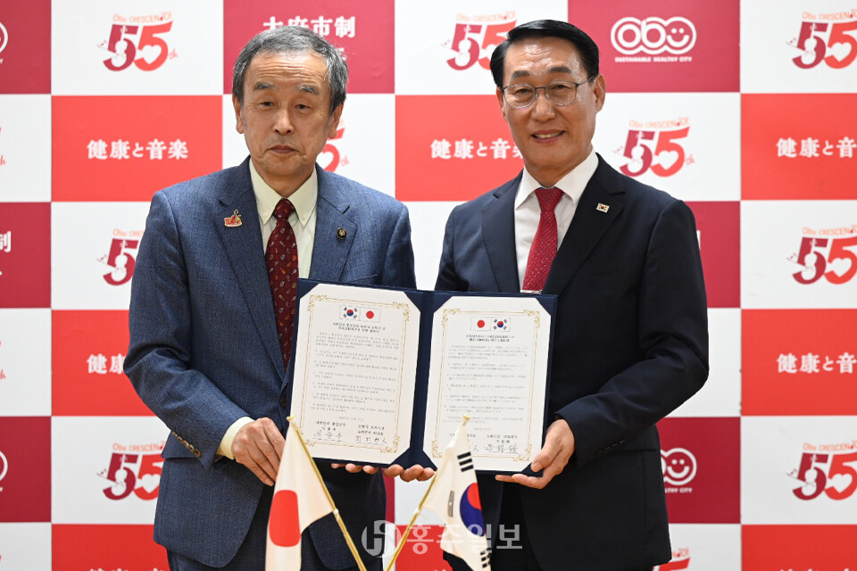 이날 협약식에는 이용록 홍성군수와 김덕배 군의회 의장, 오카무라 히데토 오부시장, 하야카와 타카미츠 시의회 의장 등이 참석한 가운데 양 도시 간 인사교류 협약이 체결됐다.