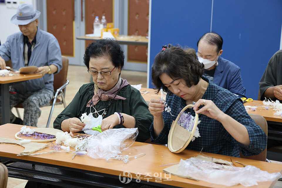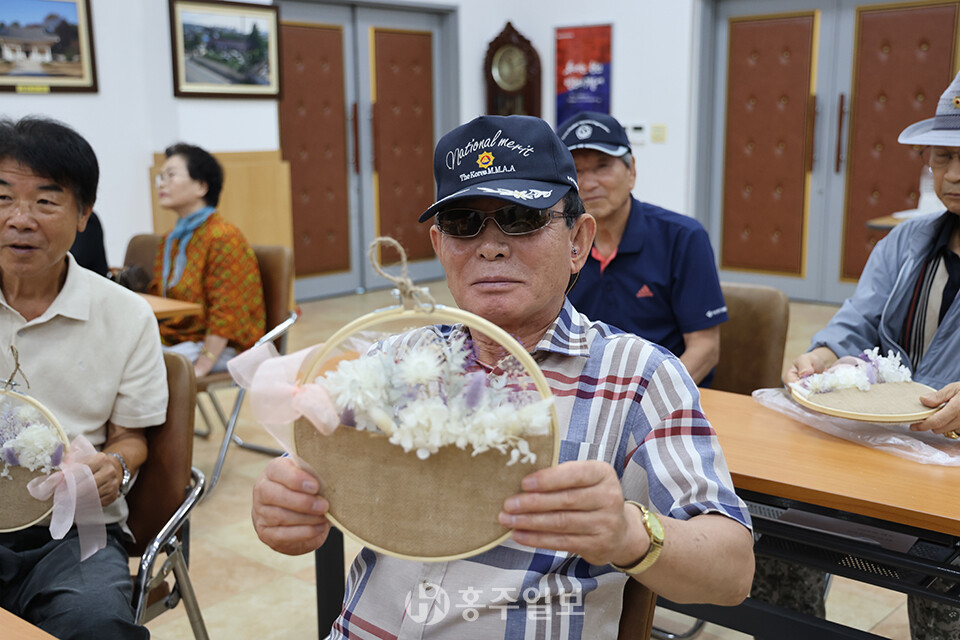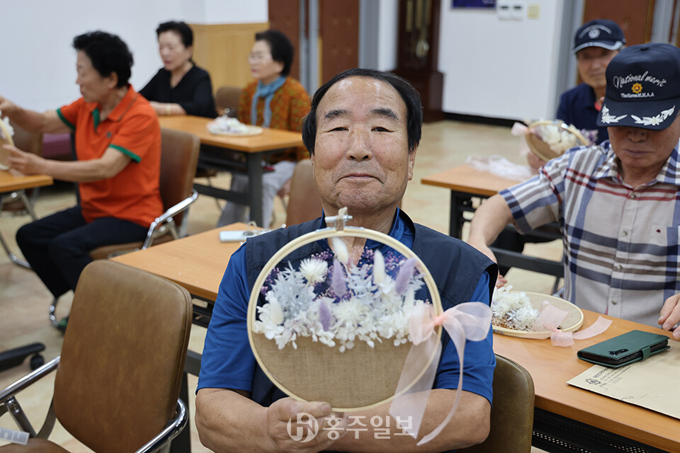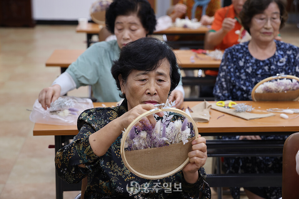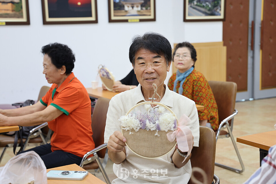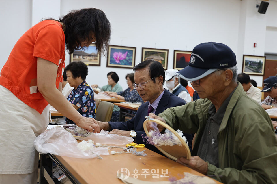 이날 건강문화교실 수업을 맡은 신용순 화목회 단독회장은 “원색의 꽃들도 예쁘지만, 파스텔톤의 예쁜 꽃들을 보면서 작품을 만드는 시간 동안 마음의 온화함을 느끼고, 행복을 느끼면서 정서에 매우 좋은 영향을 미친다”면서 “집에 있는 빈병에 들꽃을 꽂아보기도 하시면서 지속적으로 예쁜 꽃을 보면서 정서적인 안정을 느끼셨으면 좋겠고, 앞으로도 건강하시길 바란다”고 말했다.