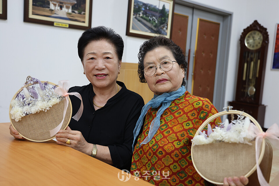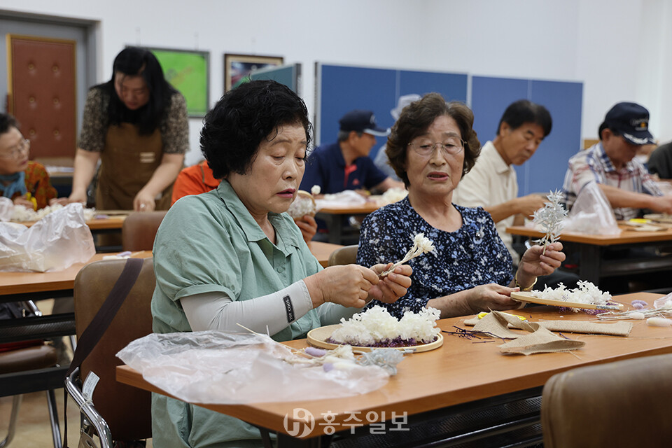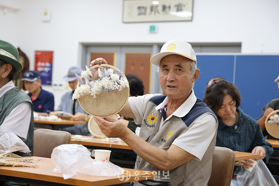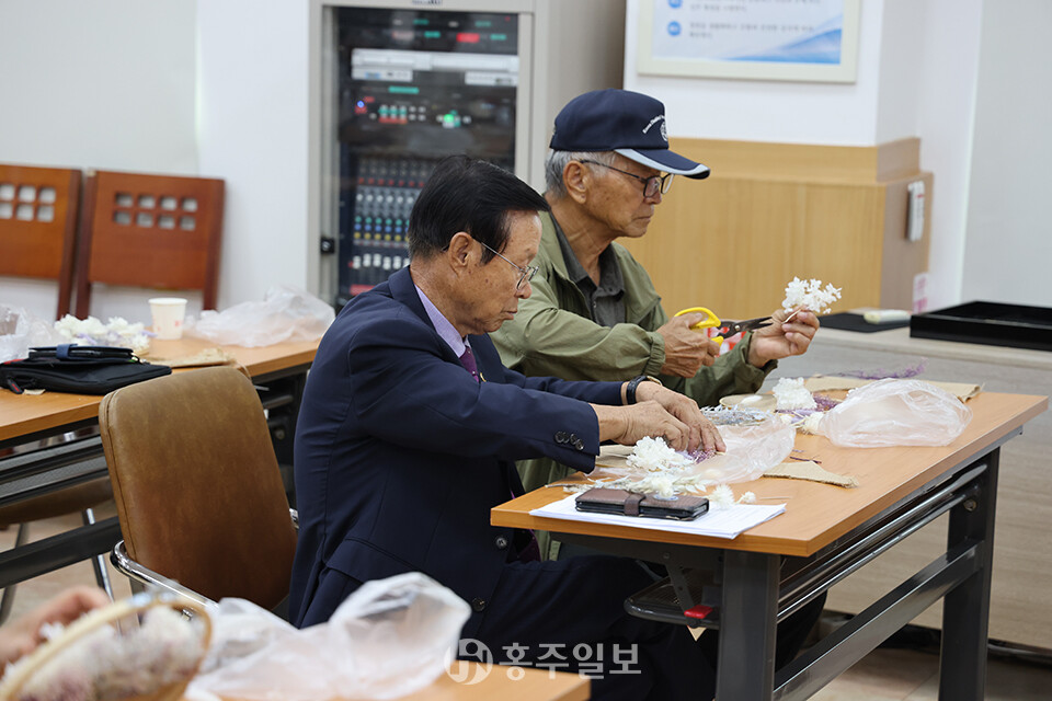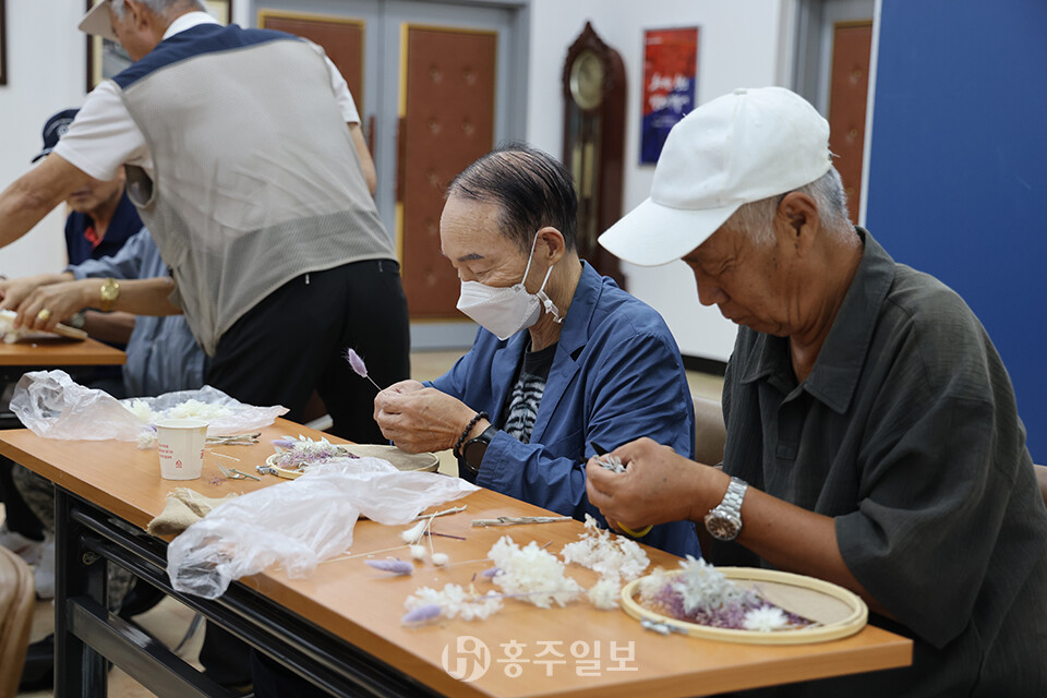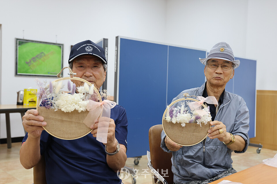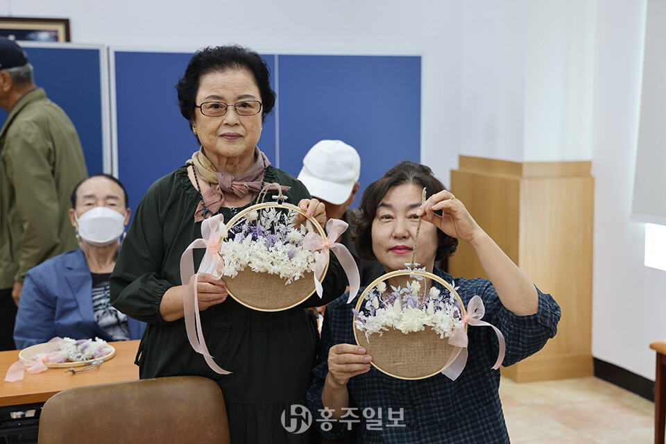 이날 건강문화교실 수업을 맡은 신용순 화목회 단독회장은 “원색의 꽃들도 예쁘지만, 파스텔톤의 예쁜 꽃들을 보면서 작품을 만드는 시간 동안 마음의 온화함을 느끼고, 행복을 느끼면서 정서에 매우 좋은 영향을 미친다”면서 “집에 있는 빈병에 들꽃을 꽂아보기도 하시면서 지속적으로 예쁜 꽃을 보면서 정서적인 안정을 느끼셨으면 좋겠고, 앞으로도 건강하시길 바란다”고 말했다.