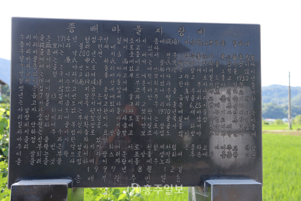 종배마을 주변에는 마당들, 서당골, 승냥골, 제비실, 고시담, 서낭당, 솔고개 등이 남아 있다. 1980년대에 대청댐이 생기면서 농토와 마을 주변의 7∼8만 평에 이르는 좋은 밭은 물론 물 잘 빠지는 논이 수몰되면서 이주민이 생기면서 작은 마을이 되고 말았다.