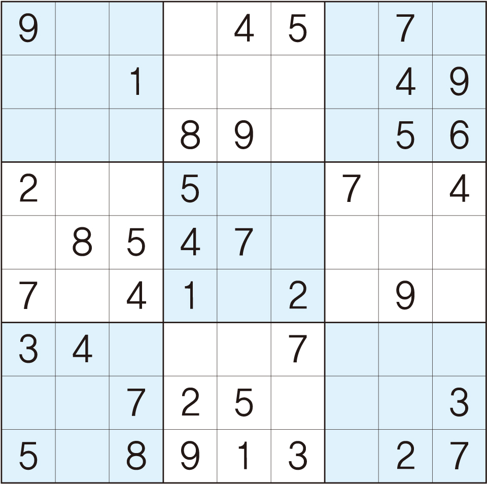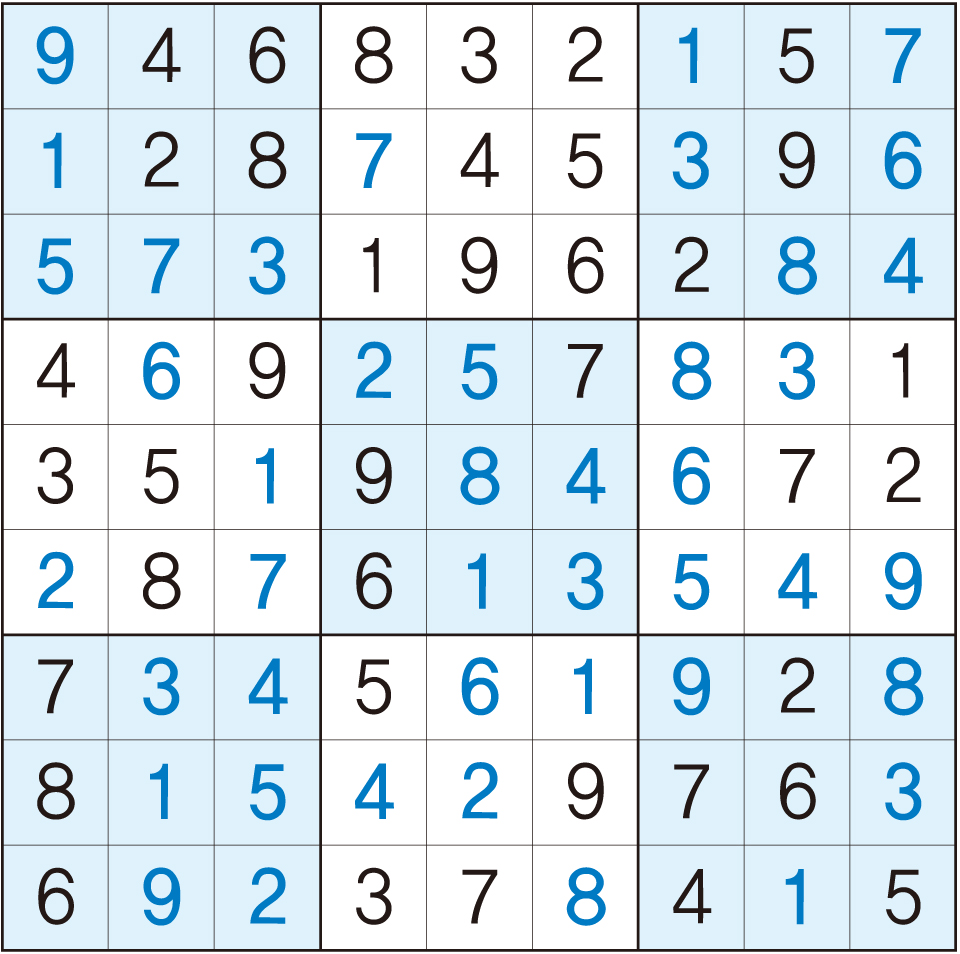 3. 큰 정사각형(9x9) 안에 있는 작은 정사각형(3x3) 안에는 숫자 1~9가 각 한 번씩 들어간다.