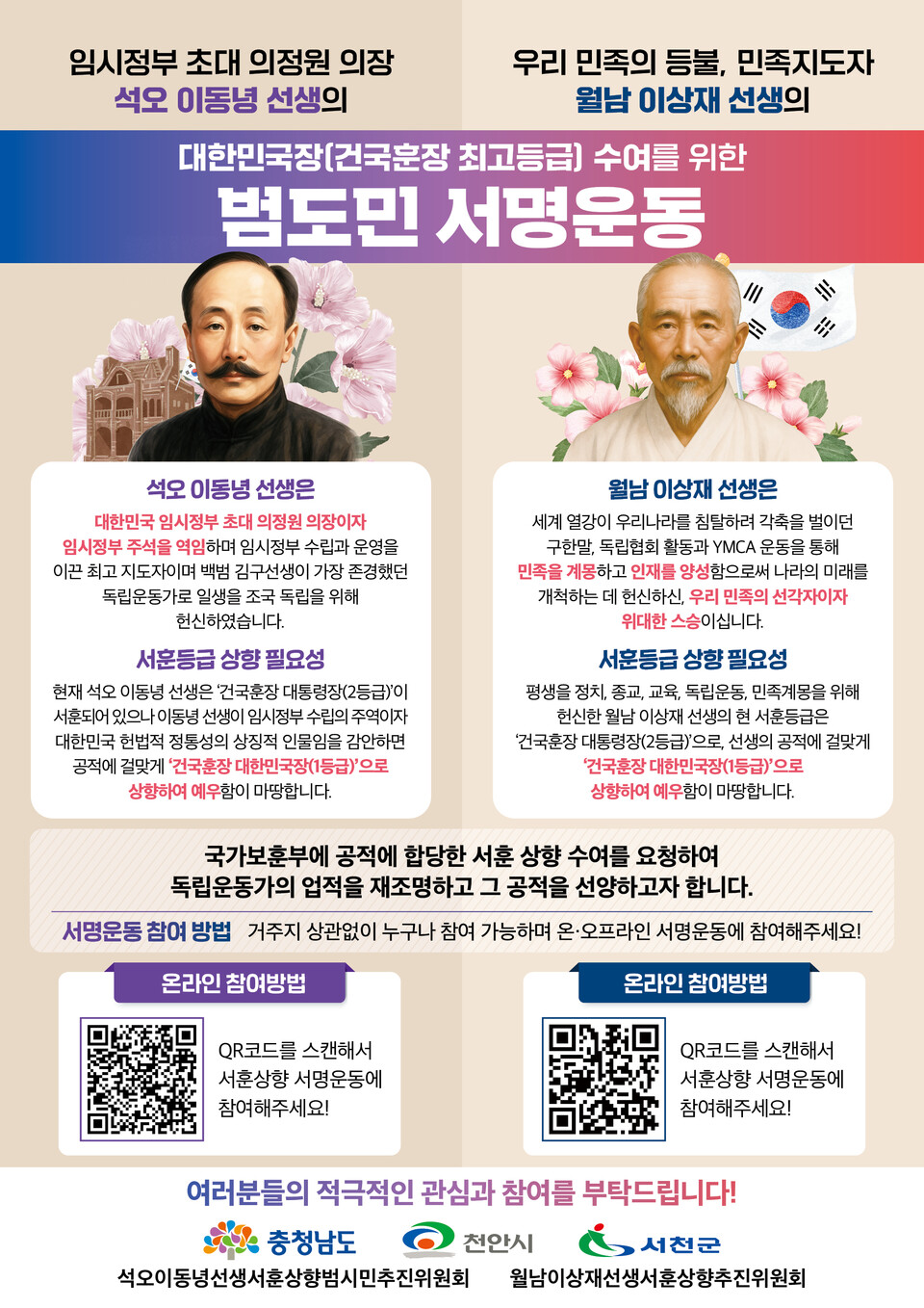 이에 도는 10만 명 이상 서명 참여를 목표로 지역에서부터 두 독립운동가의 공적을 재조명할 수 있도록 천안시와 서천군, 기념사업회 등과 협업체계를 강화하는 등 행정력을 집중하고 있다.