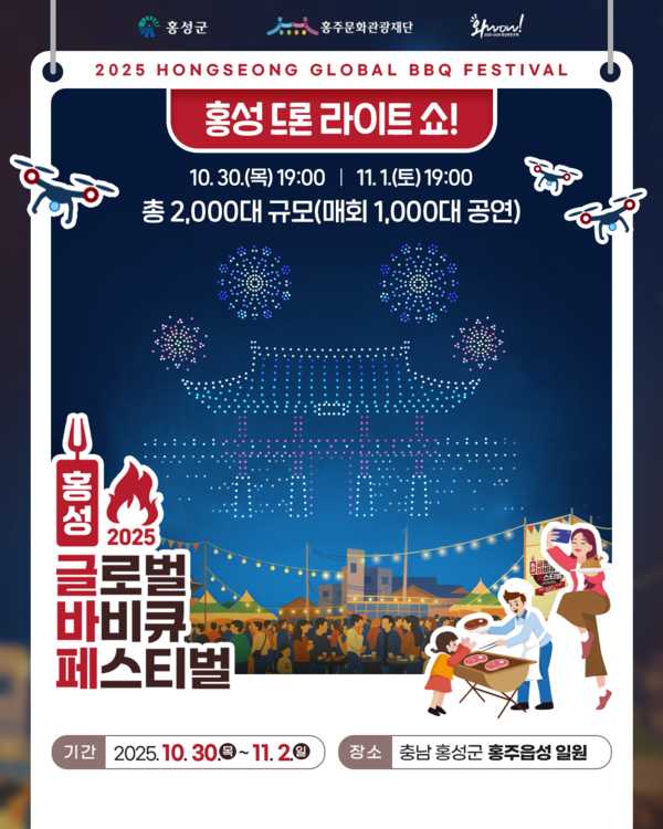 홍성군이 오는 10월 30일(목)과 11월 1일(토) 저녁 7시, ‘2025 홍성 글로벌 바비큐 페스티벌’과 ‘홍성사랑 국화축제’를 주제로 한 2000대 드론라이트 쇼를 선보인다.