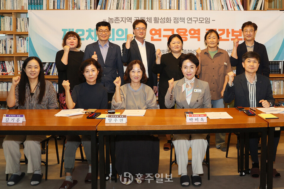 [홍주일보 한기원 기자] 충남도의회 ‘농촌지역 공동체 활성화 정책 연구모임(대표 박미옥 의원·국민의힘)’은 지난 13일 홍성군 장곡면 오누이다목적회관에서 제2차 회의와 연구용역 중간보고회를 열고, ‘충청남도 농촌 경제·사회서비스 공동체 지원센터’ 설치 방안을 논의했다.<사진>