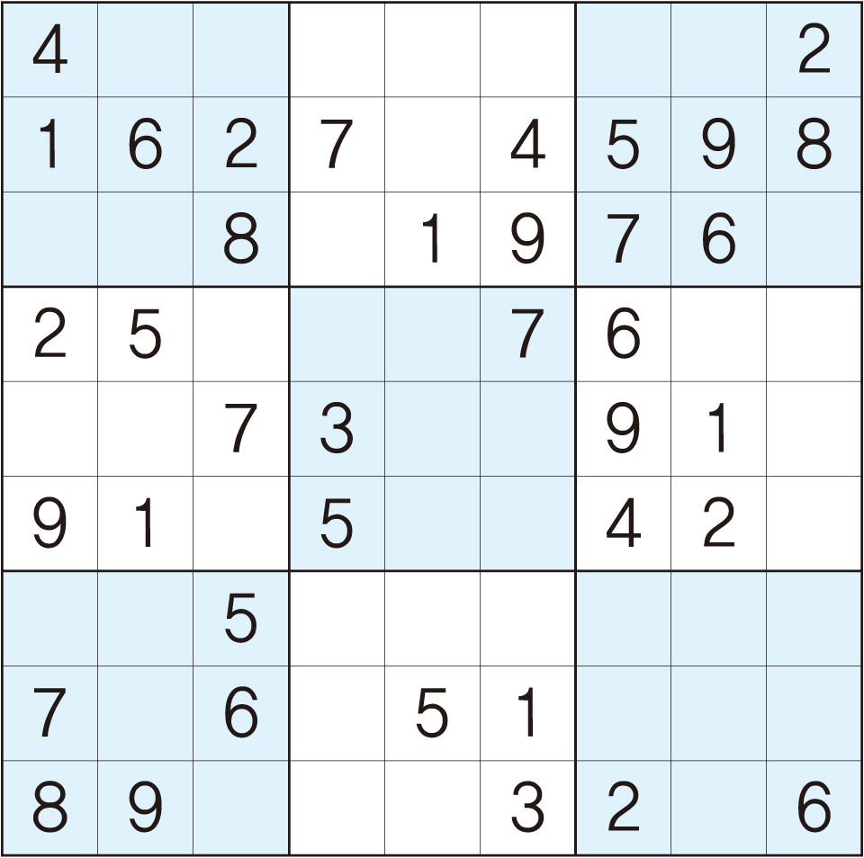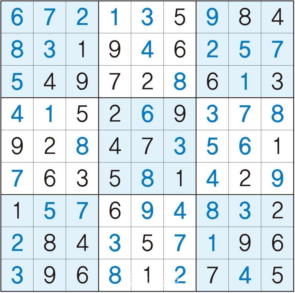 3. 큰 정사각형(9x9) 안에 있는 작은 정사각형(3x3) 안에는 숫자 1~9가 각 한 번씩 들어간다.
