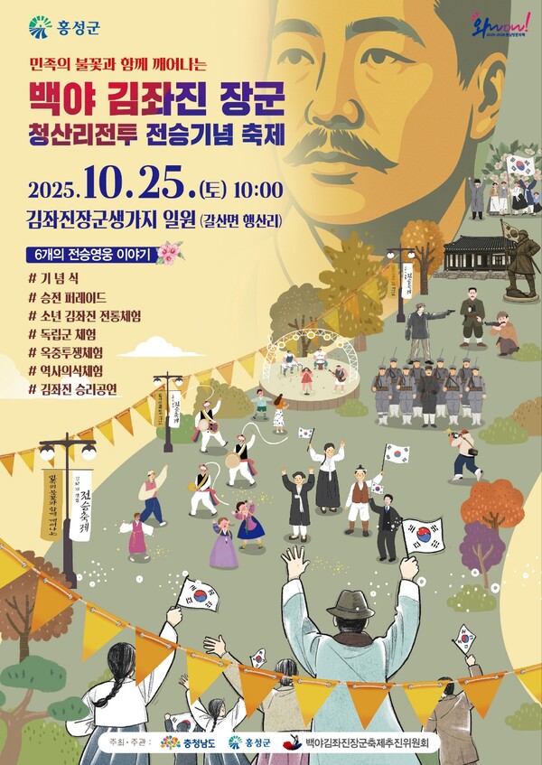 오는 25일 열리는 ‘백야 김좌진 장군 청산리 전승기념 축제’는 갈산면 행산리 김좌진 장군 생가 일원에서 개최되며, △청산리 전투 퍼레이드 △헌화·분향 △공연 △역사 체험 프로그램 등 다채로운 프로그램이 운영된다. 특히 김좌진 장군의 삶과 기개를 느낄 수 있는 전시와 퍼포먼스를 직접 체험하며 역사적 의미를 함께 나누게 된다.