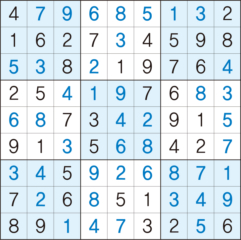 3. 큰 정사각형(9x9) 안에 있는 작은 정사각형(3x3) 안에는 숫자 1~9가 각 한 번씩 들어간다.