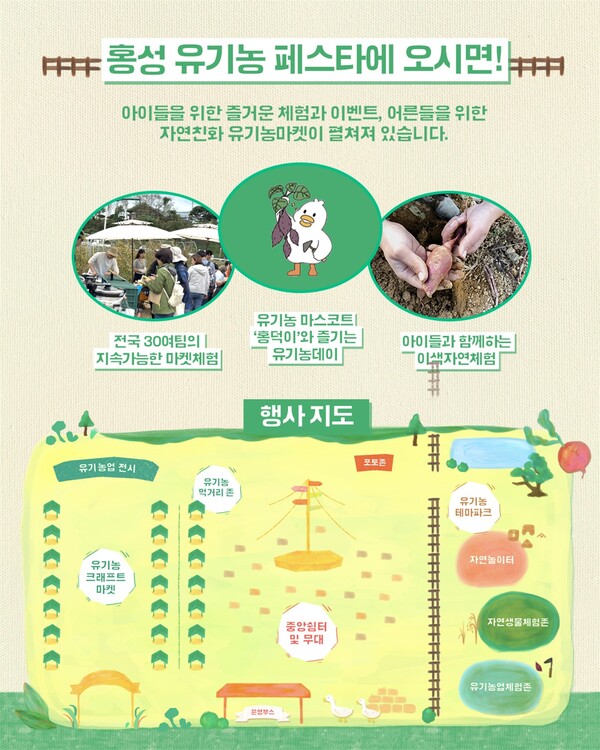 특히 올해는 홍성 유기농업을 대표하는 캐릭터 ‘홍덕(Duck)이’가 첫선을 보인다. 오리농법을 모티브로 한 홍덕이는 행사장 곳곳에서 퍼포먼스와 포토존 이벤트를 통해 관람객들에게 즐거움을 선사할 예정이다.
