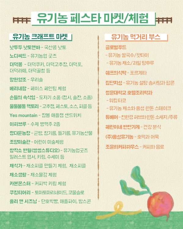 행사장에는 유기농 농가와 로컬 브랜드, 청년 창업가 등 30여 팀이 참여하는 ‘유기농 크래프트 마켓’이 열린다. 유기농산물과 로컬 수공예품, 친환경 식품 등 지속가능한 라이프스타일을 제안하며 모든 부스는 친환경 펄프용기와 다회용기를 사용한다. △홍성 수제맥주 △유기농 디저트 △유기농 과일 탕후루 △친환경 허브와 한돈 소세지 등 홍성 로컬 브랜드가 참여해 지역 농식품의 새로운 가능성을 보여준다.