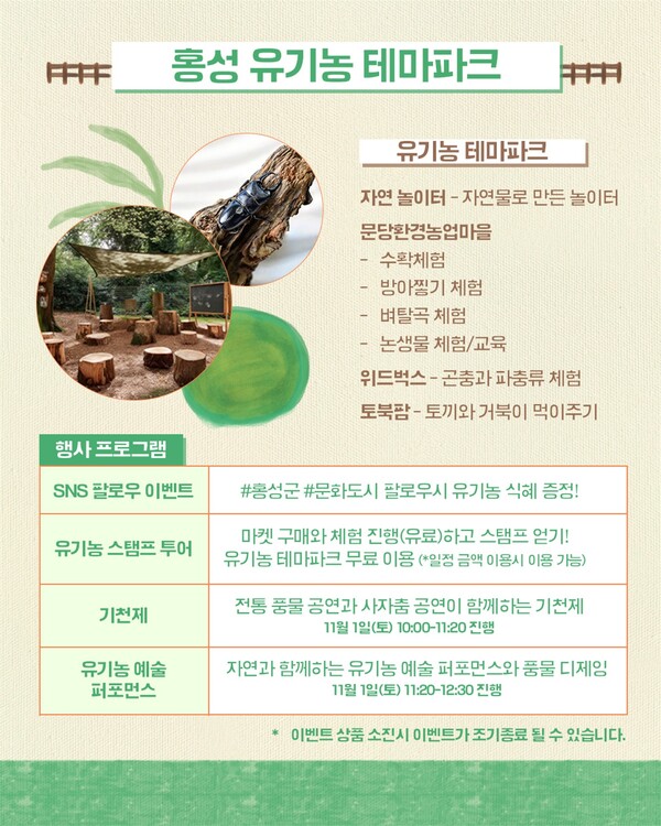 축제 기간에는 △홍성군과 문화도시 홍성 공식 SNS 팔로우 이벤트 △유기농 스탬프 투어 △유기농 예술 퍼포먼스 등 참여형 프로그램이 상시 운영되며 11월 1일 오전 10시에는 한 해의 결실에 감사하는 ‘기천제’가 열려 전통공연과 풍물 디제잉이 어우러진 특별한 무대가 마련된다.