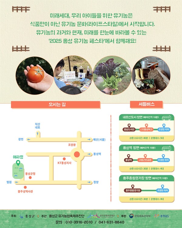 한편 이번 축제는 ‘대한민국 문화도시 홍성’ 사업과의 협력을 통해 홍주문화관광재단과 홍성군 유기농업축제추진단이 공동으로 주관한다.