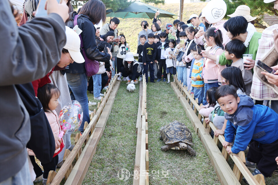 [홍주일보 홍성=한기원 기자] 지난달 30일부터 나흘간 홍주읍성 잔디광장에서 열린 ‘2025 홍성 유기농 페스타’ 현장에서 토끼와 거북이의 달리기 경주가 펼쳐졌다. 빠른 토끼보다 느리지만 꾸준히 나아간 거북이가 결승선을 먼저 통과하자, 이를 지켜보던 아이들은 함성을 지르며 즐거운 추억을 남겼다. 사진은 지난 1일 토끼와 거북이의 달리기 경주를 바라보며 응원하고 있는 아이들.