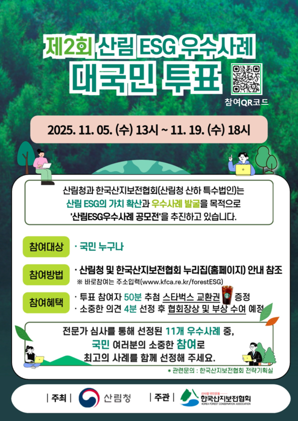 이번 공모전의 대국민 투표는 오는 19일 18시까지 온라인으로 진행되며, 한국산지보전협회 홈페이지 내 배너를 통해 참여할 수 있다.