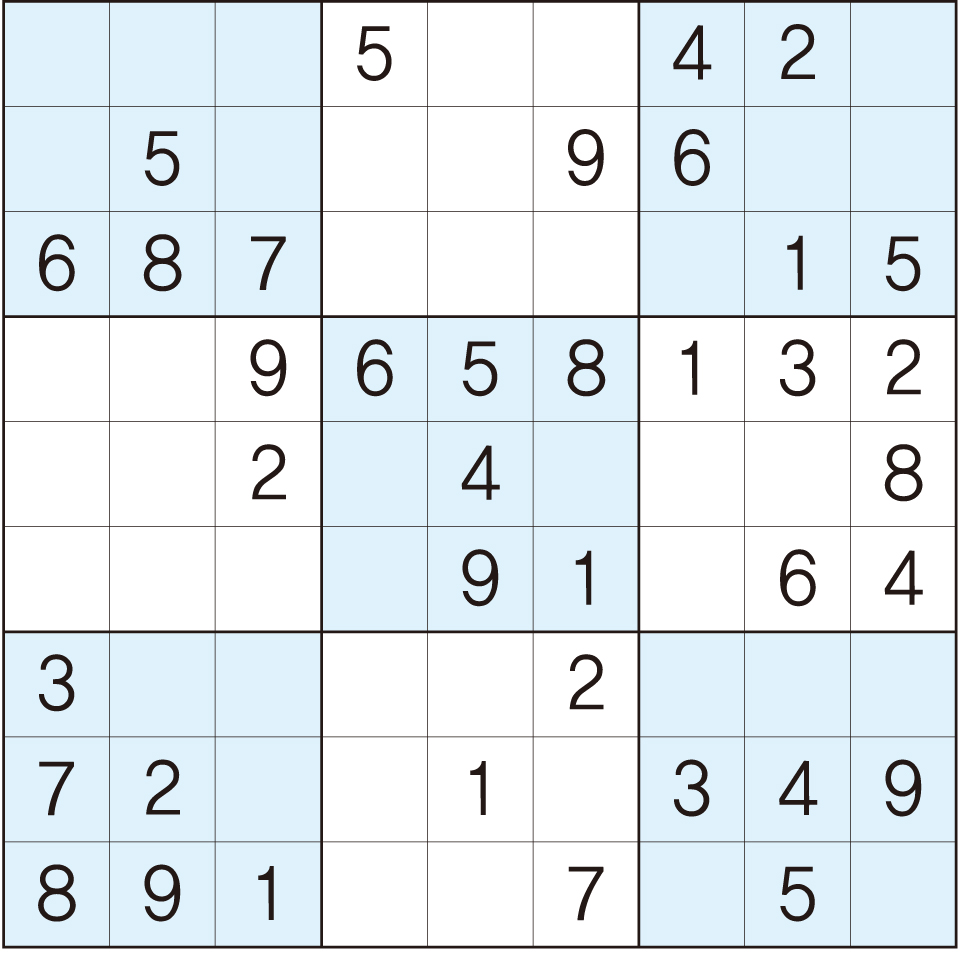 3. 큰 정사각형(9x9) 안에 있는 작은 정사각형(3x3) 안에는 숫자 1~9가 각 한 번씩 들어간다.