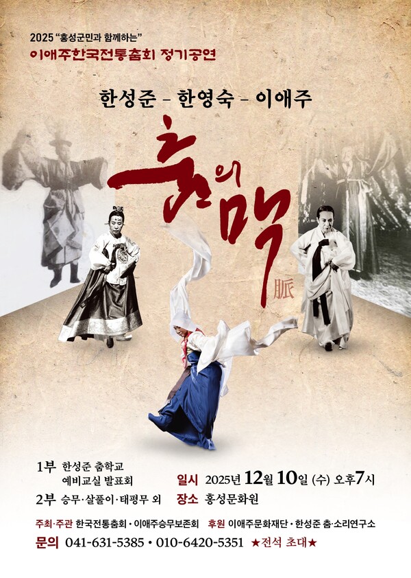 한편, 이애주한국전통춤회는 다음달 10일 홍성문화원에서 공연 ‘춤의 맥’을 선보인다. 이번 공연에서는 지난 9월부터 3개월간 진행 중인 ‘한성준 춤학교 예비교실’의 학생 13명이 1부에서 발표회를 열고, 2부에서는 승무·살풀이·태평무 등 전통춤 무대가 이어질 예정이다. 이 역시 한성준-한영숙-이애주로 이어지는 춤의 계보를 지역에서 계승하고자 하는 움직임의 일환이다. 자세한 사항은 한성준 춤·소리연구소(041-631-5385)로 문의하면 된다.