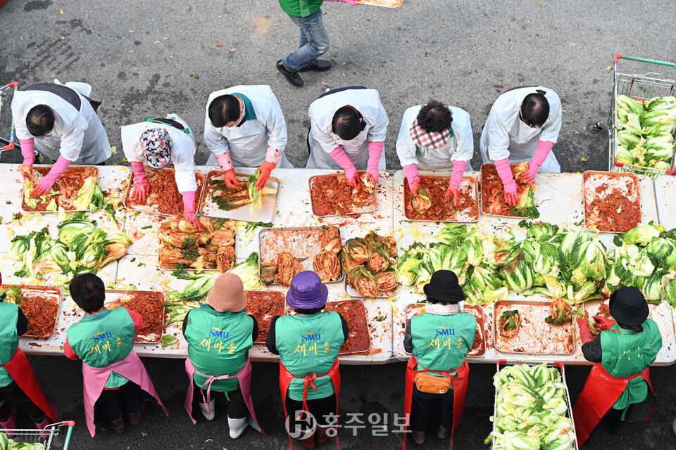 [홍주일보 홍성=김용환 인턴기자] 가을의 끝자락, 서늘한 바람과 포근한 햇살이 교차하는 계절. 한해 땀 흘려 키운 배추와 무가 정성으로 버무려진다. 붉게 물든 손끝마다 담긴 사랑이 이웃의 겨울을 향해 익어간다. 작은 정성이 모여 큰 온기가 되고, 서로를 잇는 마음이 다시 한 해의 희망을 채워가는 시간이 된다. 사진은 지난 24일 홍북읍새마을지도자협의회가 진행한 ‘사랑의 김장 나눔행사’에서 이웃에게 전할 김장김치를 담그는 모습.