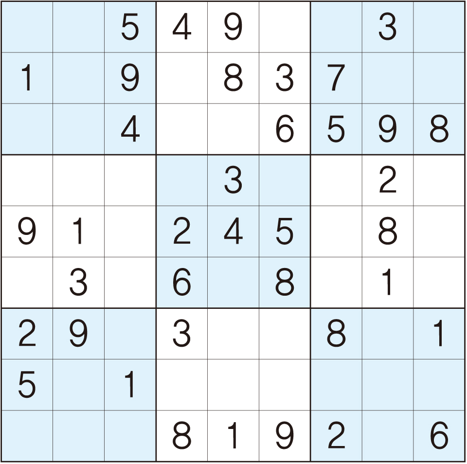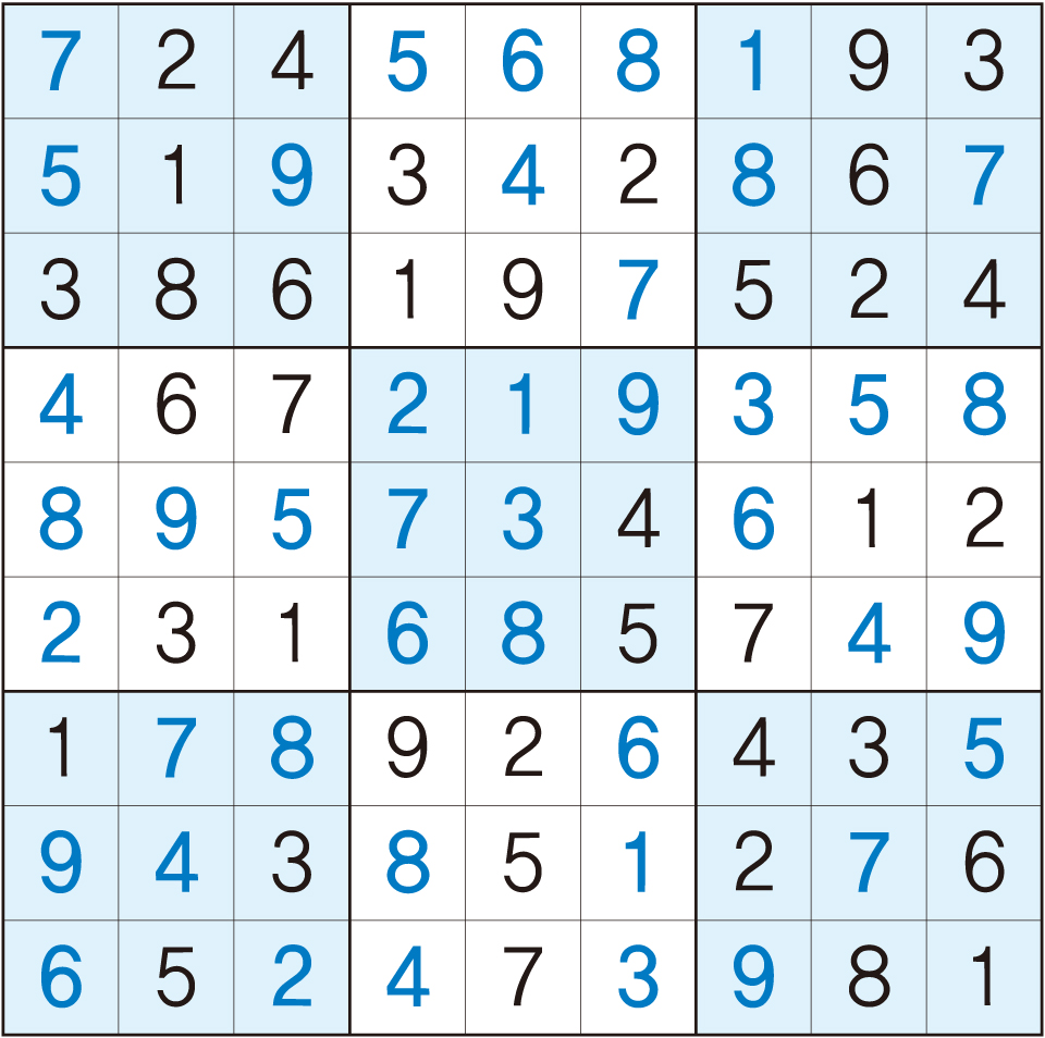 3. 큰 정사각형(9x9) 안에 있는 작은 정사각형(3x3) 안에는 숫자 1~9가 각 한 번씩 들어간다.