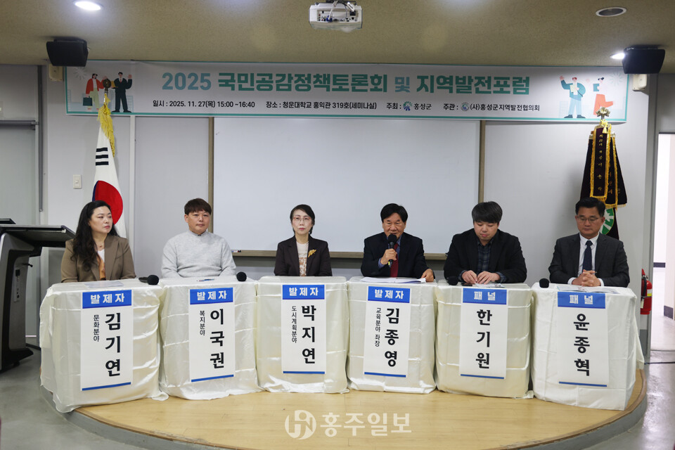 [홍주일보 홍성=김용환 인턴기자] (사)홍성군지역발전협의회(회장 이순하)는 지난달 27일 청운대학교 홍익관에서 ‘2025 군민공감정책토론회·지역발전포럼’을 개최하고, 군민 삶의 질 향상을 위한 네 분야의 비전과 실행 전략을 논의했다.