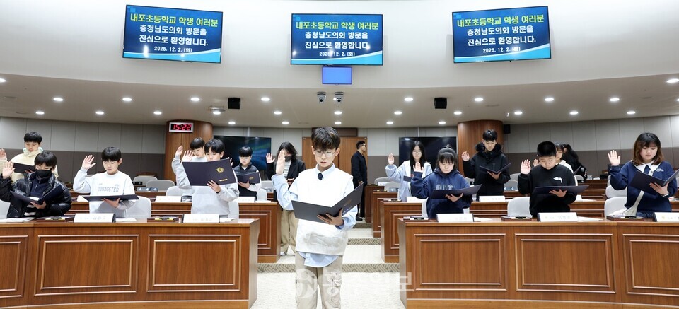 충남도의회(의장 홍성현)는 지난 2일 도의회 본회의장에서 홍성 내포초등학교 학생 20명과 지도교사 1명이 참여한 가운데 ‘청소년 의회교실’을 운영했다.<사진>