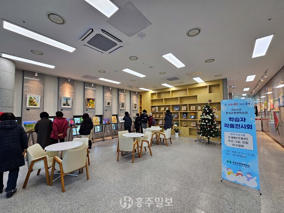 홍성군은 오는 30일까지 홍성군평생학습관 1층 마주침공간에서 2025년 정규 프로그램 종강을 기념한 ‘학습자 작품전시회<사진>’를 연다. 이번 전시는 아크릴화, 수채화, 민화 등 예술 강좌 수강생들이 한 해 동안 배운 내용을 바탕으로 완성한 작품들을 중심으로 구성됐다.