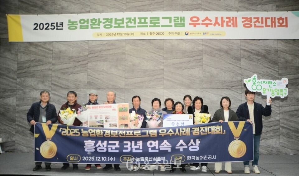 한편 홍성군은 농업환경보전프로그램 우수사례 경진대회에서 3년 연속 수상하며 주민 주도의 환경보전 활동을 전국적으로 인정받았다. 올해로 3번째를 맞은 우수사례 경진대회는 농림축산식품부가 주최하고 한국농어촌공사가 주관했으며, 다양한 농업환경 개선 모범사례를 발굴·전파해 농업인의 환경 인식을 높이는 것을 목표로 했다.
