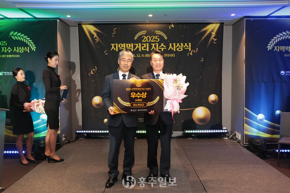 홍성군은 지난 9일 농림축산식품부가 주최하고, 한국농수산식품유통공사에서 주관하는 ‘2025년 지역먹거리 지수 평가’에서 3년 연속 A등급을 달성해 ‘우수상(한국농수산식품유통공사 사장상)’을 수상했다.<사진>