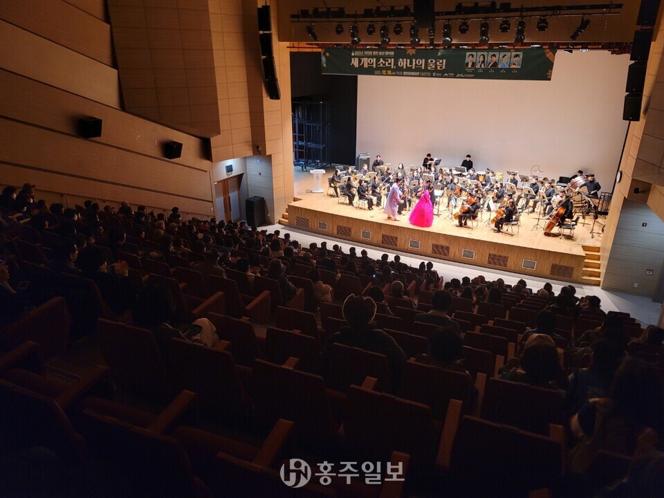 이번 음악회에는 광천 출신 예술가들과 홍성군립오케스트라가 참여해 테너, 소프라노, 그리고 우리 고유의 가락을 선사하는 소리꾼이 함께 무대를 꾸몄다. 아름다운 선율이 어우러지며 ‘세 개의 소리’가 ‘하나의 울림’을 만들어내 300여 명의 관람객에게 깊은 감동을 선사했다.