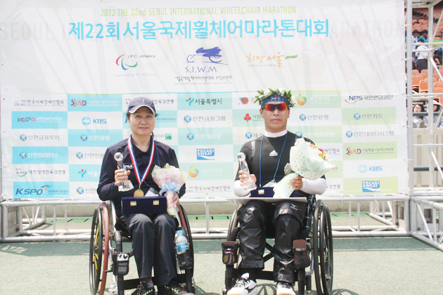 홍성군장애인체육회(회장 김석환)는 지난 3일부터 4일까지 서울 잠실종합운동장 주변에서 개최된 '제22회 서울국제휠체어마라톤대회' 5km 경쟁부문에서 금 1, 은 1개를 획득했다. 홍성군 선수단은 남녀 선수 2명이 참가해 남자 장년부에서 엄찬섭<사진 오른쪽> 선수가 1위를, 여자 장년부에서 박현분 선수가 2위에 올랐다.