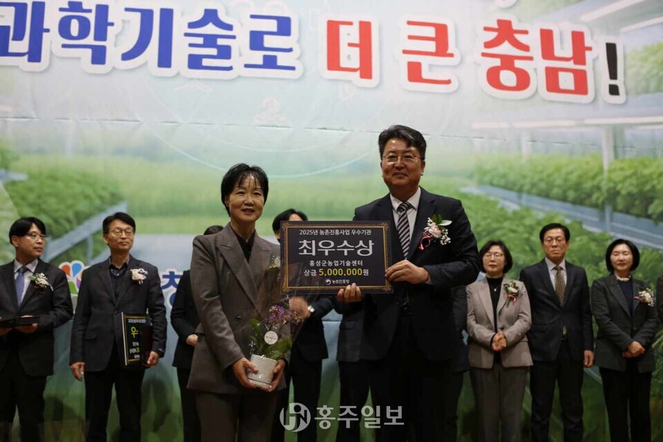 홍성군농업기술센터는 지난 11일 충청남도 농촌진흥사업 성과보고회에서 우수기관 최우수상을 수상한 데 이어, 농촌진흥청이 실시한 2025년 농촌진흥사업 평가에서 △농업기술보급혁신 대상 △농업인대학 운영 최우수상 △식량작물 기술보급 우수상 등 3개 부문을 석권하며 올해 농촌진흥사업 분야 ‘4관왕’의 영예를 안았다.<사진>