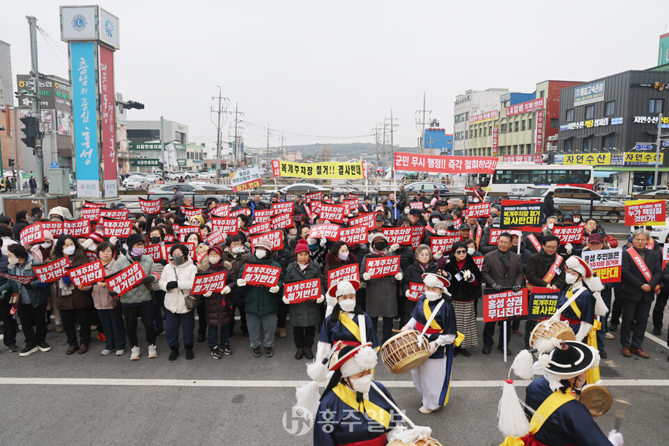 [홍주일보 홍성=김용환 인턴기자] 해가 구름 뒤에 가려진 아침, 붉은 피켓을 든 홍성군민들이 홍성군청 앞에 모였다. 차가운 날씨에도 주민들의 목소리는 군청 앞을 넘어 5일장을 맞은 홍성전통시장 일대까지 울려 퍼졌다.