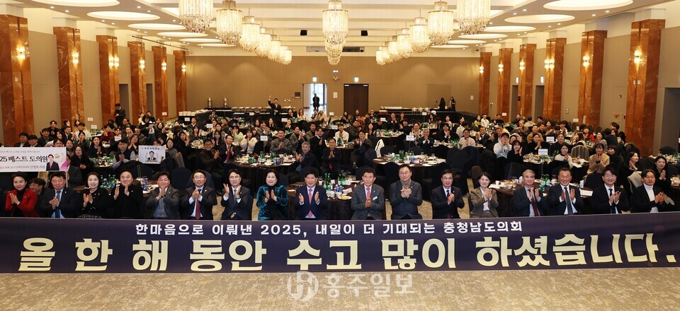 충남도의회는 지난 15일 예산 스플라스 리솜 그랜드홀에서 도의원과 사무처 직원, 도지사, 교육감 등 220여 명이 참석한 가운데 ‘2025년 한마음 송년 워크숍’을 개최했다.