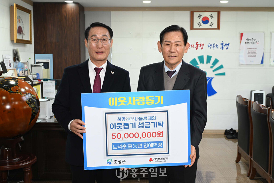 노석순 홍동면 명예면장(원영건업 대표이사)은 지난 10일, 홍성군청을 방문해 지역사회의 어려운 이웃을 돕기 위한 성금 5000만 원을 홍성군에 기탁하며 훈훈한 감동을 선사했다. 기탁한 성금은 지역 활성화와 복지사업을 위해 쓰일 예정이다.