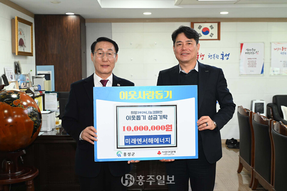 홍성군에 도시가스를 공급하는 미래엔서해에너지(대표 송민섭)가 지난 10일 홍성군청을 방문해 ‘희망2026 나눔캠페인’에 성금 1000만 원을 기부하며 지역을 위한 나눔 활동에 적극 나섰다.