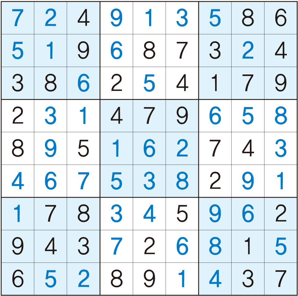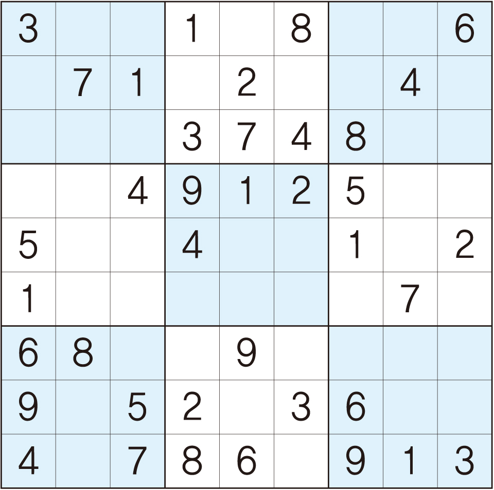 3. 큰 정사각형(9x9) 안에 있는 작은 정사각형(3x3) 안에는 숫자 1~9가 각 한 번씩 들어간다.