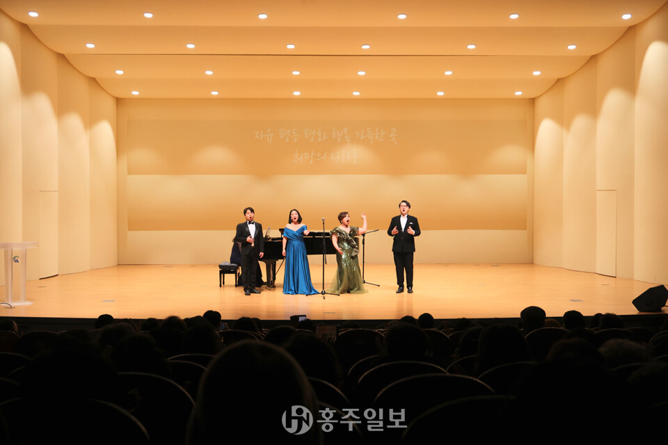 첫 무대에서는 현제명 작곡의 ‘고향 생각’을 비롯해 수선화, 얼굴, 봉선화, 보리밭 등 한국 가곡의 대표작들이 연주돼 따뜻한 향수를 전했다. 또한 청산에 살리라, 그리운 금강산, 강 건너 봄이 오듯, 희망의 나라로 등 서정성과 시대적 메시지를 함께 담은 곡들이 무대에 올라 깊은 울림을 더했다. 이 무대에는 조성숙 소프라노·박태수 테너·권소영 소프라노·박호연 바리톤 성악가가 참여했으며, 김윤희 피아니스트가 반주를 맡았다.