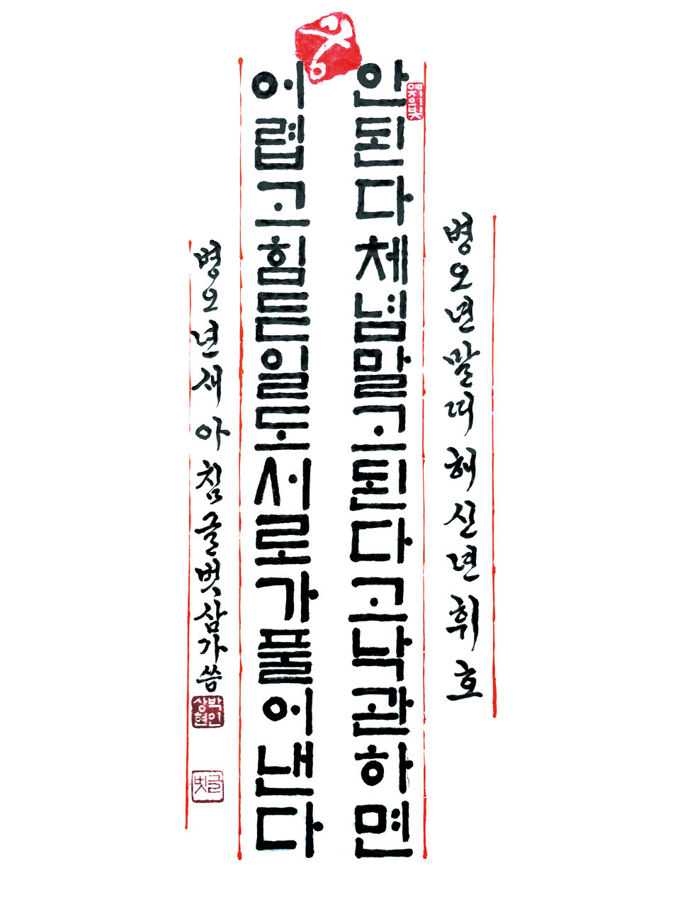 병오년(丙午年) 신년휘호는 붉은 말띠해를 맞아, 달리는 말처럼 힘들고 어려웠던 한 해를 접고 소통과 협력으로 모든 일을 풀어내는 새해를 맞이하자는 뜻과 다짐을 담았다.