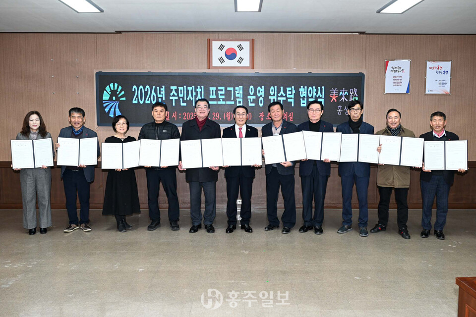[홍주일보 김용환 인턴기자] 홍성군은 지난 29일 군청 회의실에서 김노성 홍성군주민자치협의회장을 비롯한 11개 읍·면 주민자치회장이 참석한 가운데 ‘2026년 주민자치센터 프로그램 운영 위·수탁 협약식’을 개최했다.<사진>