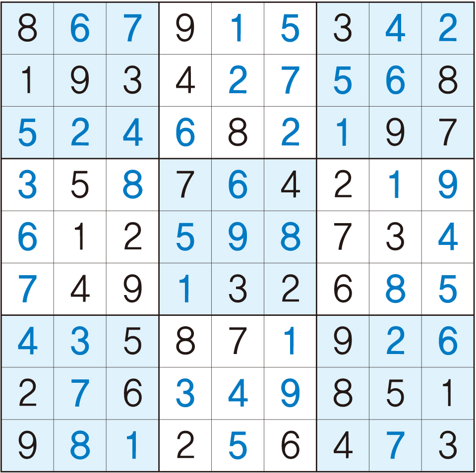 3. 큰 정사각형(9x9) 안에 있는 작은 정사각형(3x3) 안에는 숫자 1~9가 각 한 번씩 들어간다.