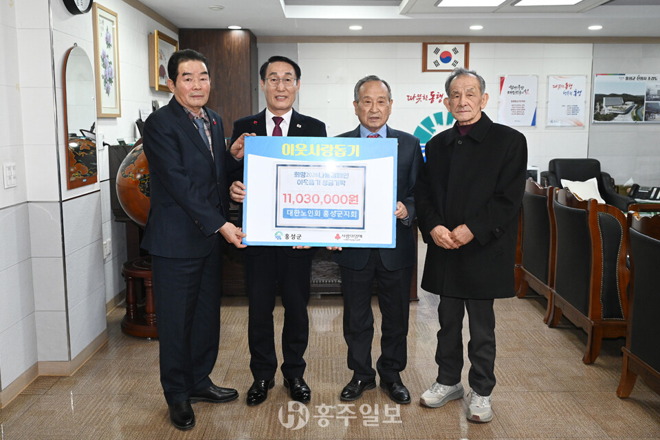 성금을 전달받은 이용록 군수는 “대한노인회 홍성군지회가 솔선수범해 이웃돕기에 적극 동참해 주신 데 감사드린다”며 “노인 세대는 우리나라 경제 발전의 주역인 만큼, 앞으로도 대한노인회 발전과 노인 복지 향상을 위한 지원을 아끼지 않겠다”고 화답했다.